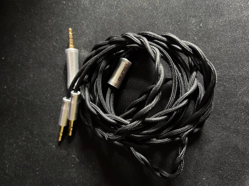 fabric cable ending in a 3.5mm termination, a 3.5mm to 6.35mm adapter and some paperwork. The cable is of decent