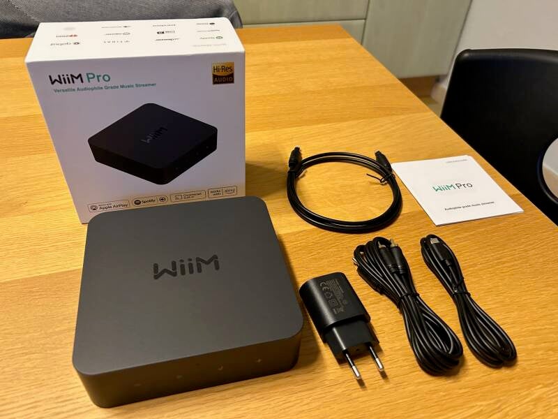This is the Wiim Pro, a Streamer, D/A Converter and Pre-Amplifier very compact and lightweight plastic unit. This entry level streamer sells for around 180€ in Europe. Inside the box you will find the unit itself, a USB Power Adapter, a USB Type-C Cable, a RCA to RCA stereo cable, a Digital Optical Audio Toslink Cable & a User Guide.